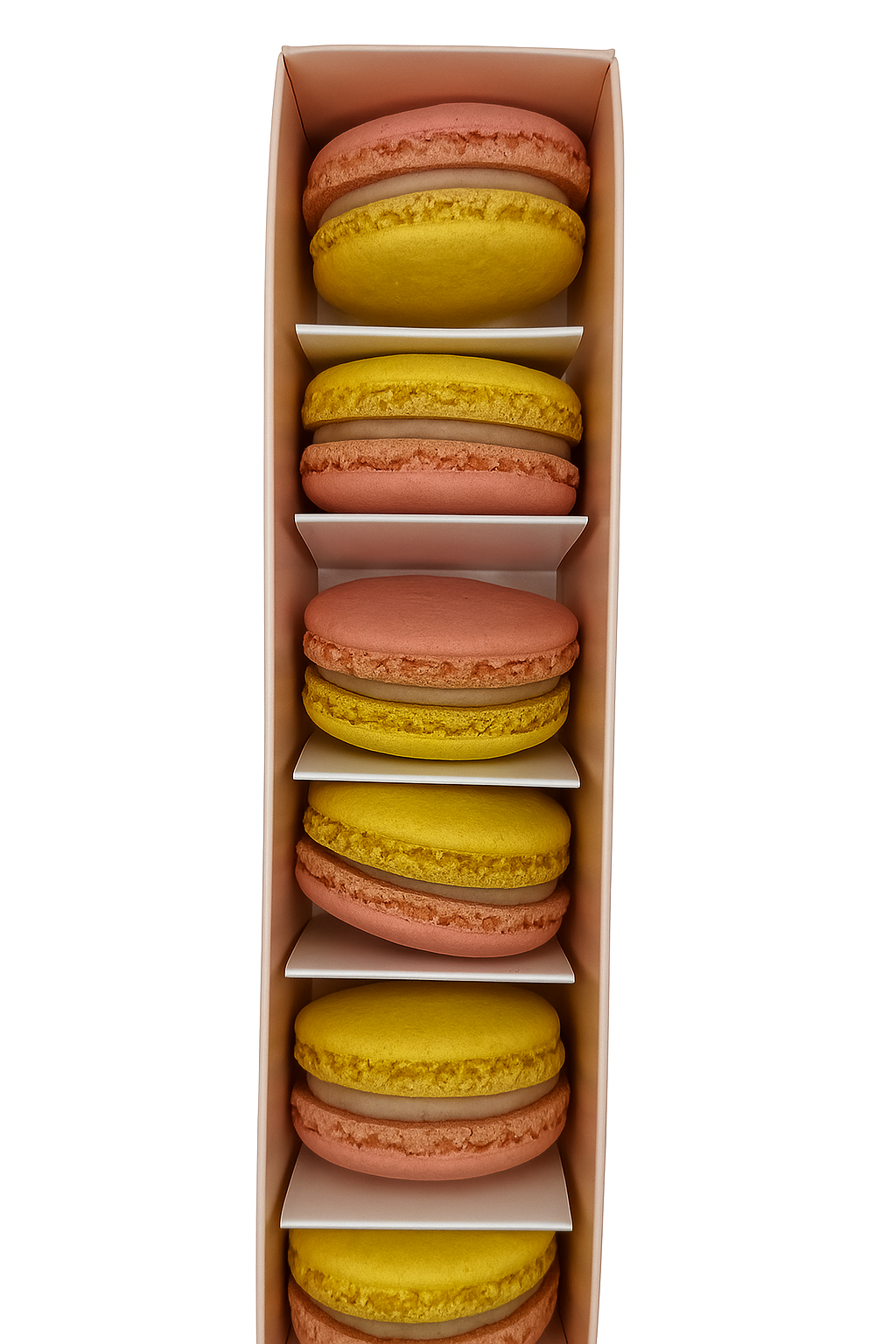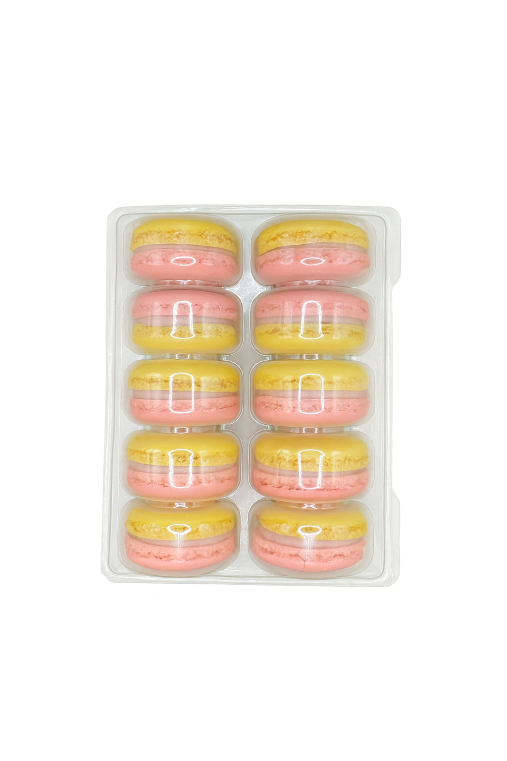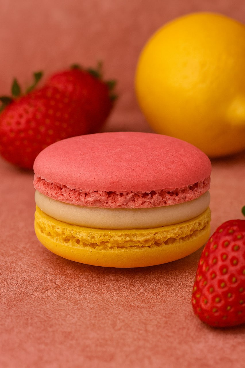 Świeży i lekki. Makaronik łączy w sobie słodycz dojrzałych truskawek z wyrazistą, pikantną nutą cytryny, ułożony na bazie z białej czekolady Callebaut.