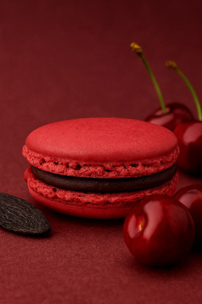 Elegancki i aromatyczny. Ten makaronik łączy w sobie cierpkie wiśnie z ciepłą, waniliową nutą bobu tonka, wtopioną w czekoladową bazę Callebaut, tworząc luksusowe doznania.
